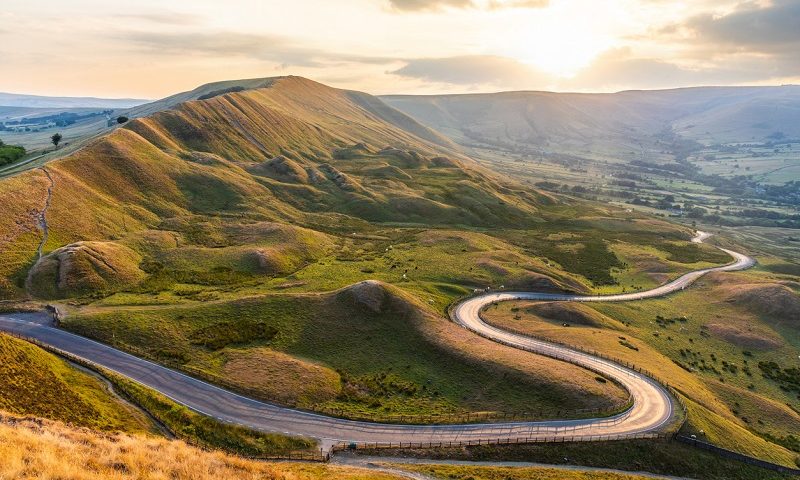 Happy family in a rental car driving on a scenic UK road