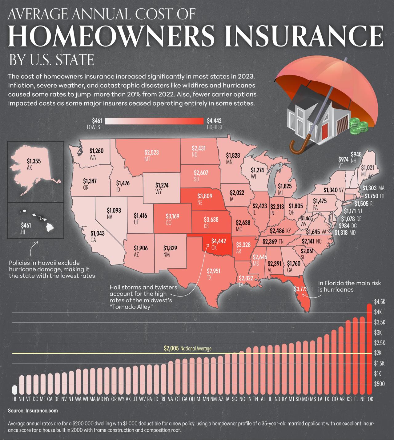 - Areas prone to natural disasters such as hurricanes, tornadoes, earthquakes, or wildfires will also see higher rates to compensate for the increased risk of property damage.